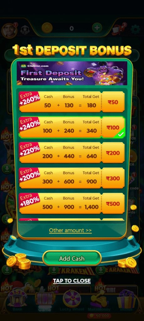 My dear friend, to deposit cash in CLUB INR application, first of all you have to open this application, after that you have to deposit cash on bank’s Icoin You have to click where you will get the option of Add Cash from where you can deposit cash as per your wish and you can earn a good amount by playing games.
