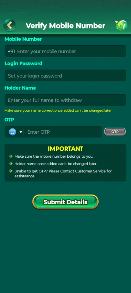 After adding a 10 digit mobile number, you will create a cute password and add it in two places as well as add a holder, after that click on the OTP icon, click on the OTP icon, a four digit OTP will come on your mobile number, after adding and verifying it, your registration will be successful and you will get a sign up bonus of ₹ 7-177 , you can send that money to your bank account and you can also earn money by playing games.