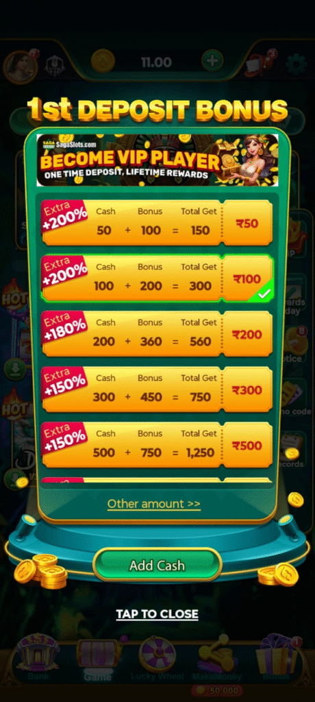 My dear friend, to deposit cash in Saga Slots application, first of all you have to open this application, after that you have to deposit cash on bank’s Icoin You have to click where you will get the option of Add Cash from where you can deposit cash as per your wish and you can earn a good amount by playing games.